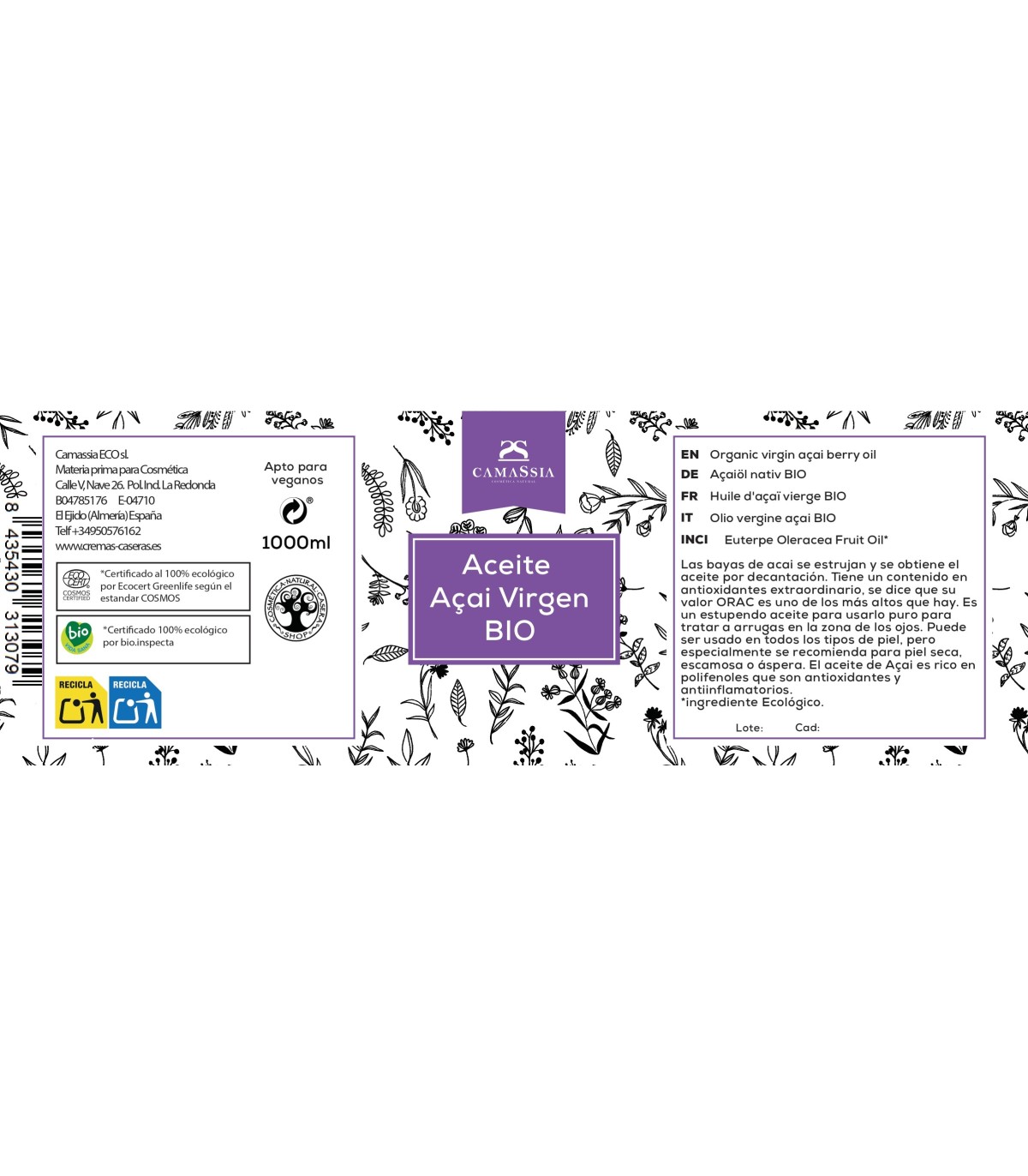 Aceite de Açai virgen BIO ecológico, natural y puro, procedente de agricultura ecológica.