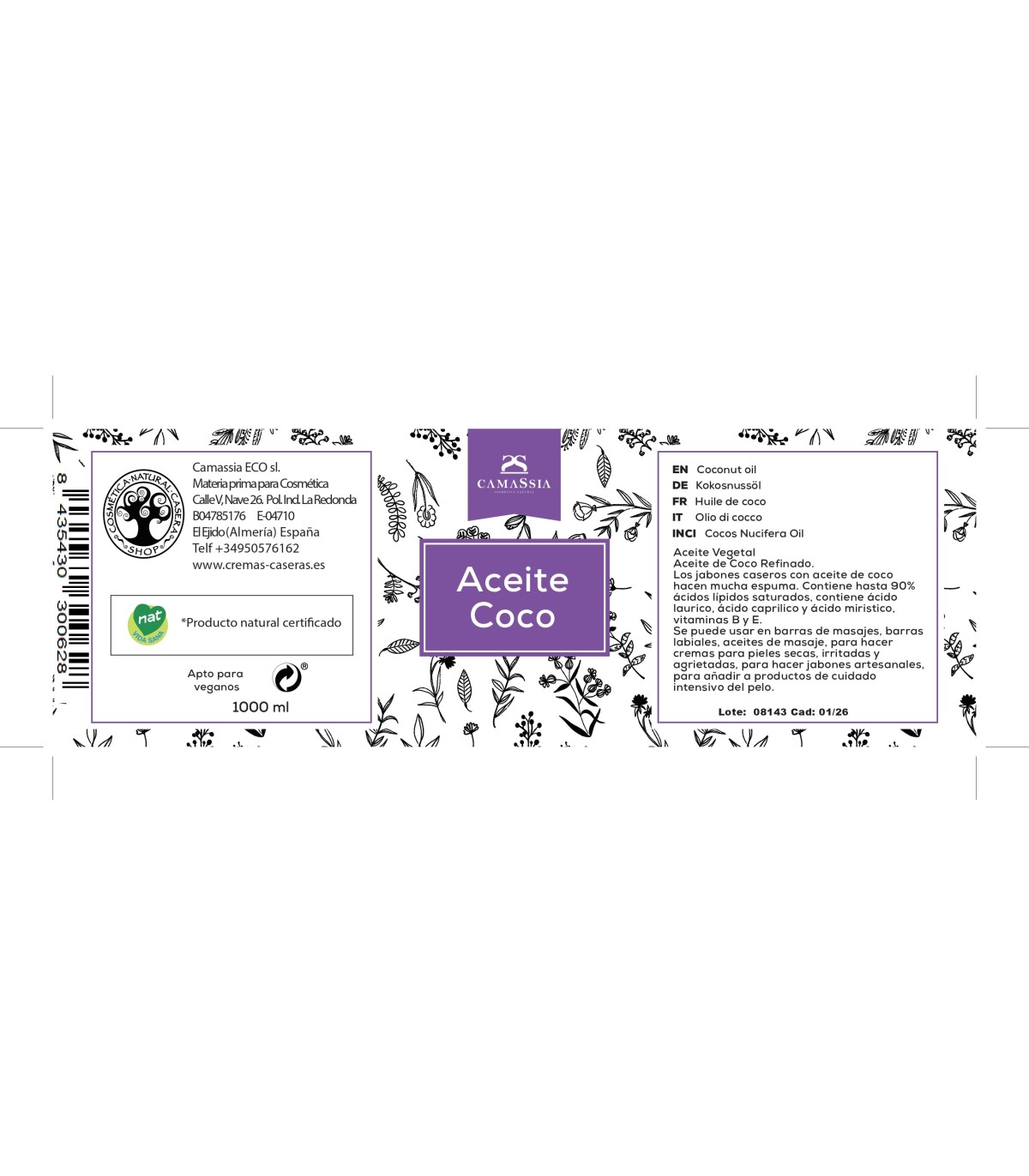 El aceite de coco se obtiene por presión y posterior refinado de la pulpa de Cocos nucifera. Es una fuente de ácidos grasos (ácido láurico, ácido cáprico, ácido mirístico y ácido palmítico) vitaminas B y E y antioxidantes que ayudan a combatir el daño que causan los radicales libres. Además, las moléculas de aceite de coco son bastante pequeñas, lo que ayuda con la absorción para obtener increíbles beneficios de acondicionamiento e hidratación. Penetra rápidamente en la piel y deja una sensación de suavidad sin ningún efecto graso.