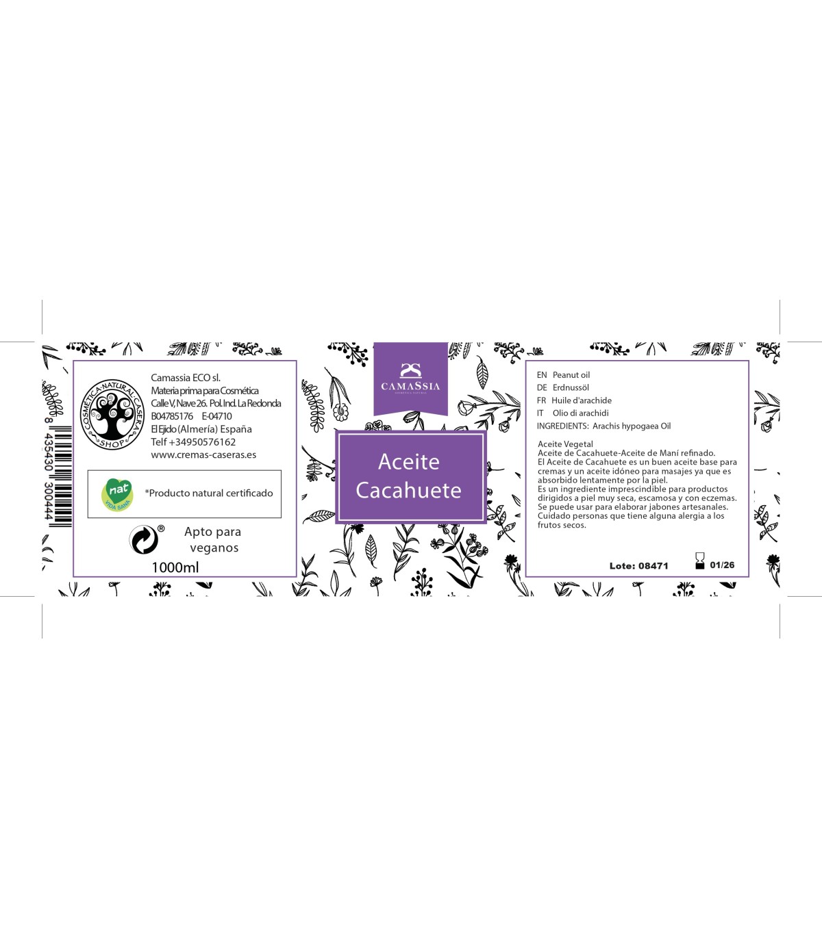 Aceite de Cacahuete es un buen aceite base para cremas y un aceite idóneo para masajes con un alto grado deslizante ya que es absorbido lentamente por la piel. Un ingrediente para productos para piel muy seca y escamosa y eczemas. Se puede usar para elaborar jabones artesanales.
