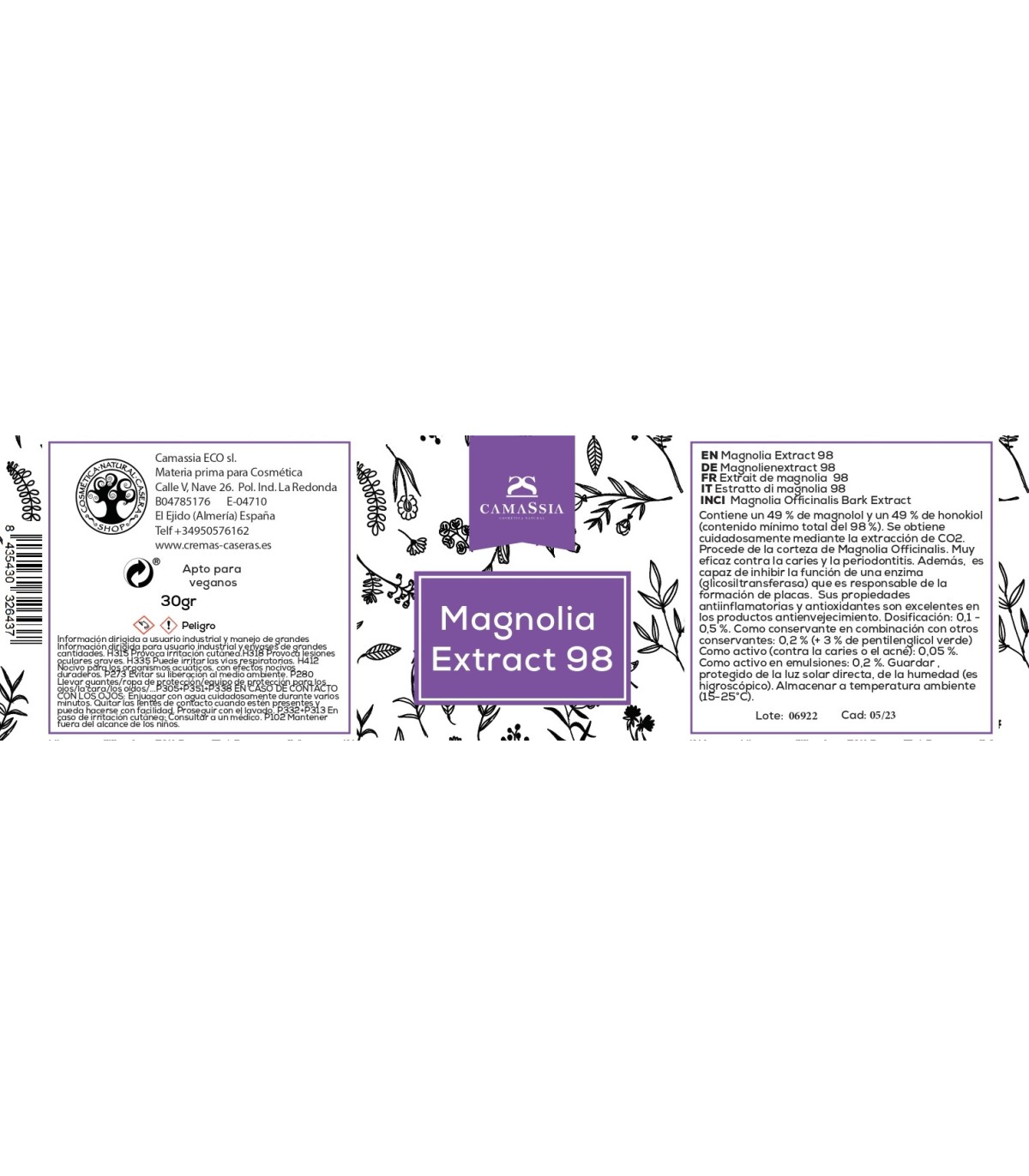 Magnolia Extract 98 contiene un 49 % de magnolol y un 49 % de honokiol (contenido mínimo total del 98 %). Se obtiene cuidadosamente mediante la extracción de CO2. Este principio activo multifuncional procedente de la corteza de Magnolia Officinalis se presenta en forma de polvo blanquecino.