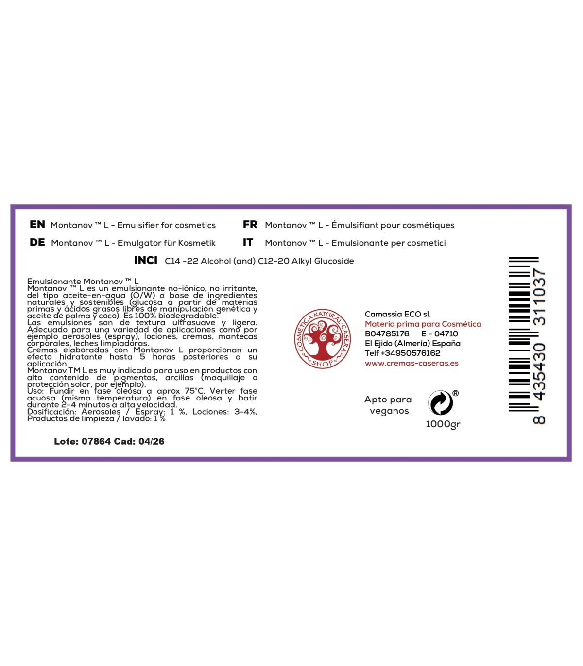 Montanov ™ L es un emulsionante no-ionico, no irritante, del tipo aceite-en-agua (O/W) a base de ingredientes naturales y sostenibles (glucosa a partir de materias primas y acidos grasos libres de manipulacion genetica y aceite de palma y coco). Es aceptado por BDIH y ECOCERT y 100% biodegradable.