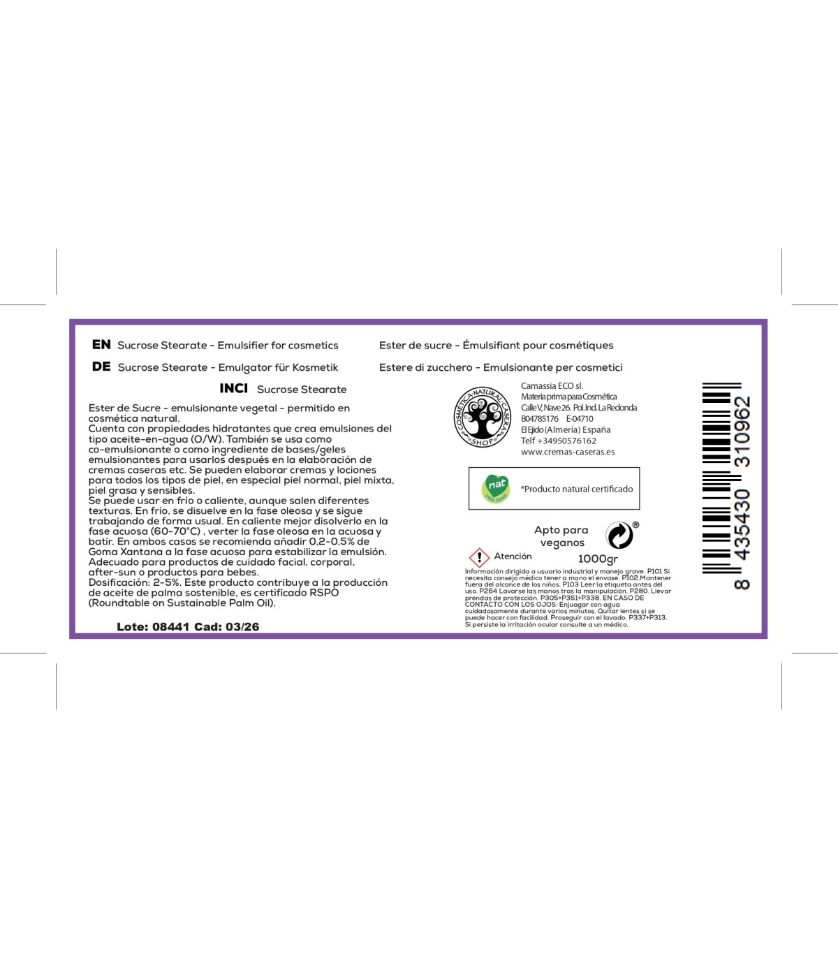 Ester de Sucre (Sucrose Stearate) es un emulsionante de origen vegetal con propiedades hidratantes que crea emulsiones del tipo aceite-en-agua (O/W). Tambien se usa como co-emulsionante o como ingrediente de bases/geles emulsionantes para usarlos despues en la elaboracion de cremas caseras etc. Se pueden elaborar cremas y lociones para todos los tipos de piel, en especial piel normal, piel mixta, piel grasa y sensibles.