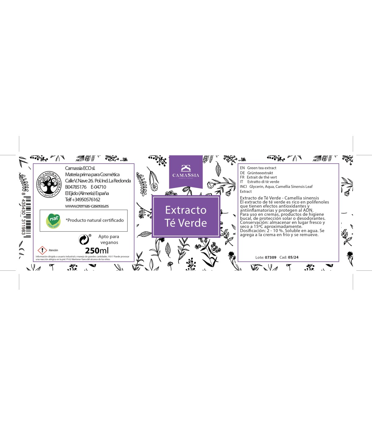 Extracto de Té Verde - Camellia sinensis - sin propilen glicol y sin conservantes