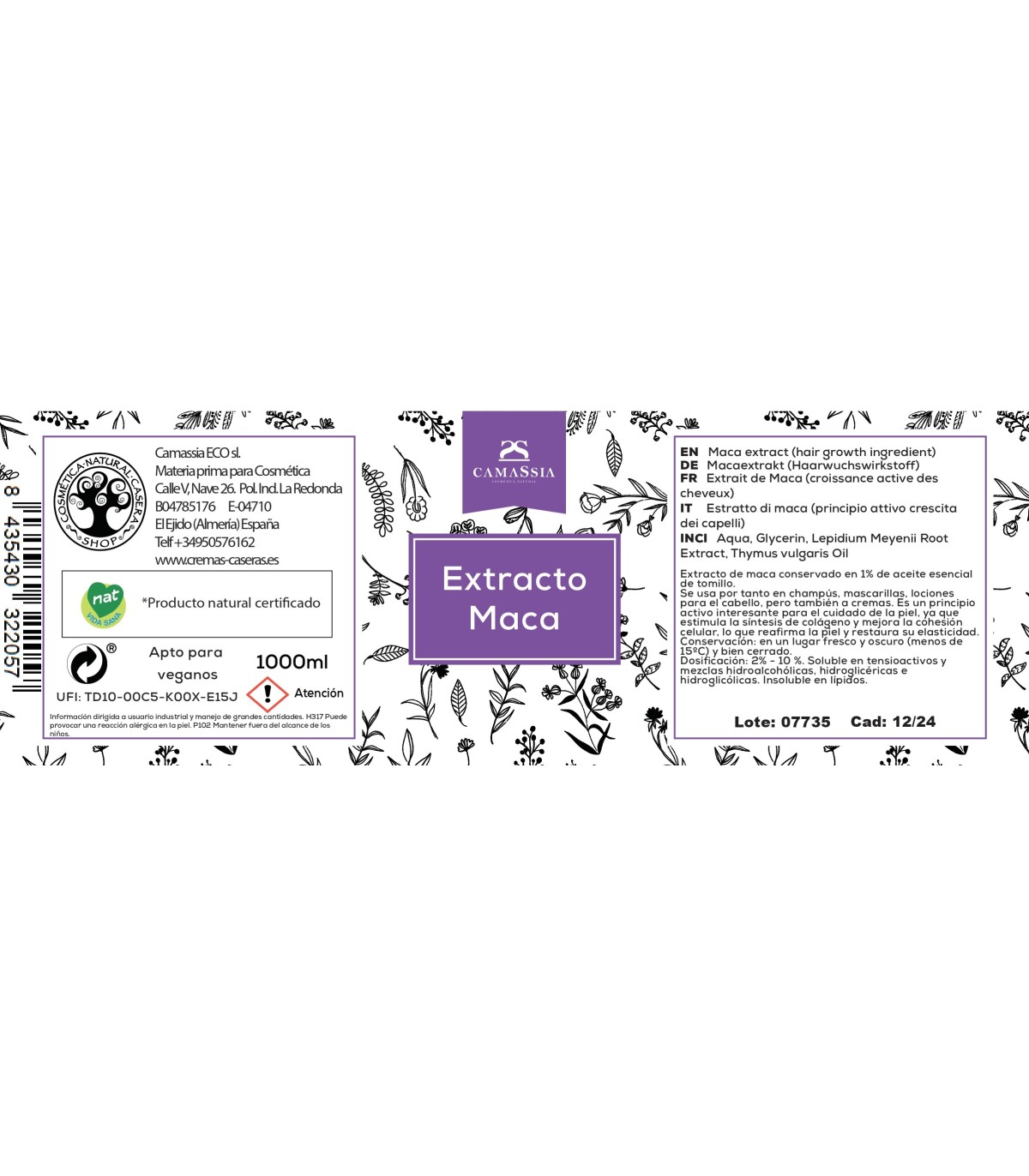 Extracto de Maca (Principio activo Crecimiento Capilar) - Extracto libre de propilen glicol y conservado con 1% de Aceite esencial de Tomillo.