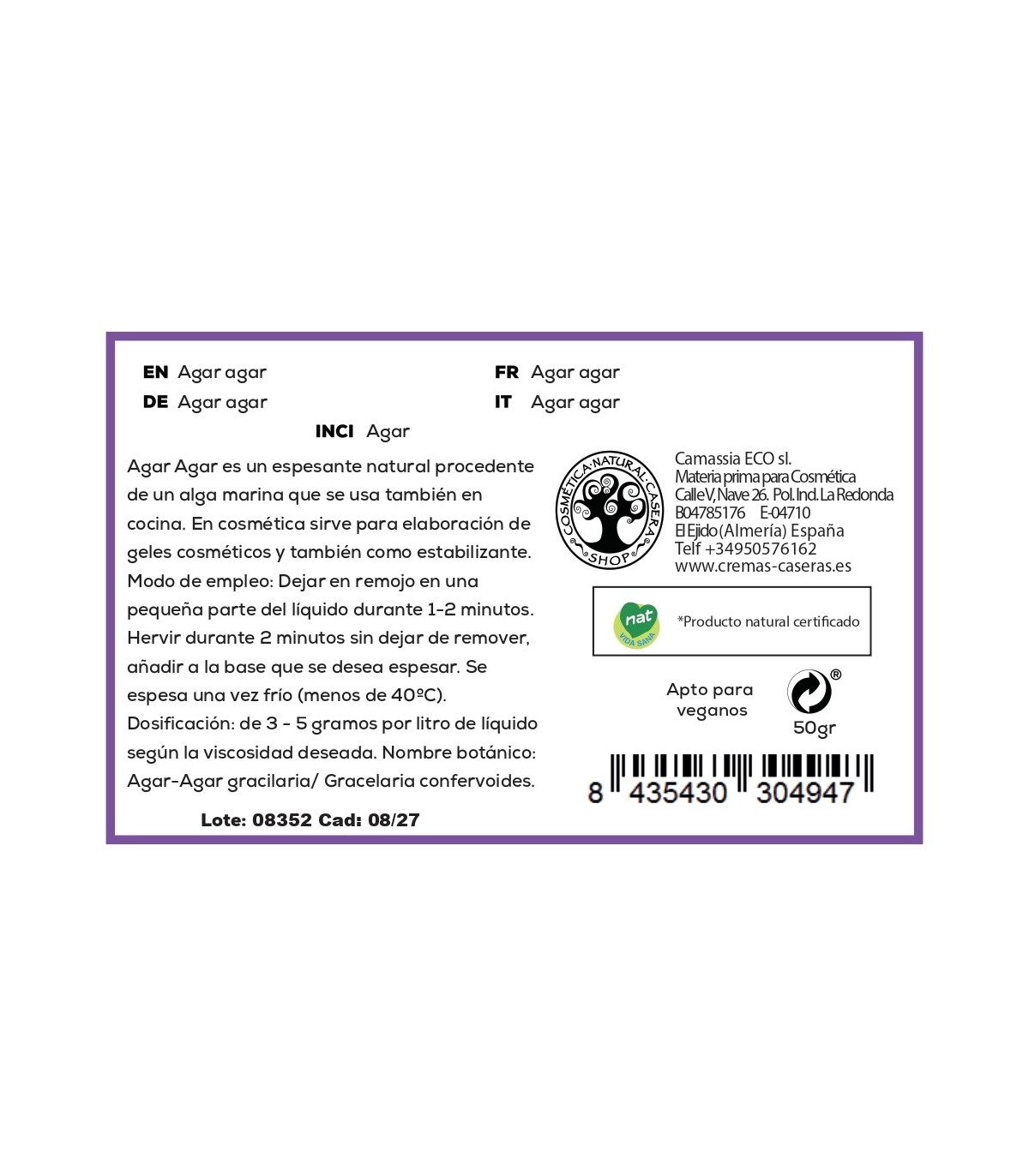 Agar Agar es un espesante natural procedente de una alga marina que se usa generalmente tambien en la cocina. En la cosmética sirve para elaboración de geles cosméticos y también de estabilizante.