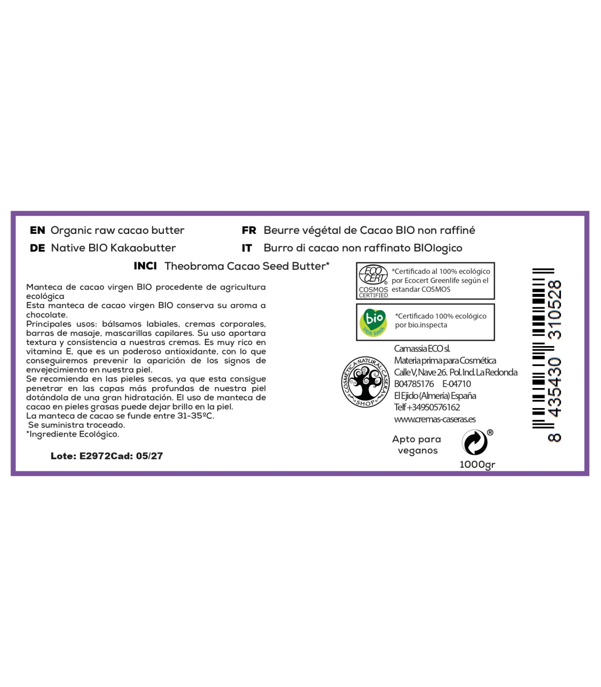 Esta manteca de cacao virgen BIO conserva su aroma a chocolate. Con manteca de cacao podemos elaborar bálsamos labiales, cremas corporales, barras de masaje, mascarillas capilares y muchos otros cosméticos caseros naturales.