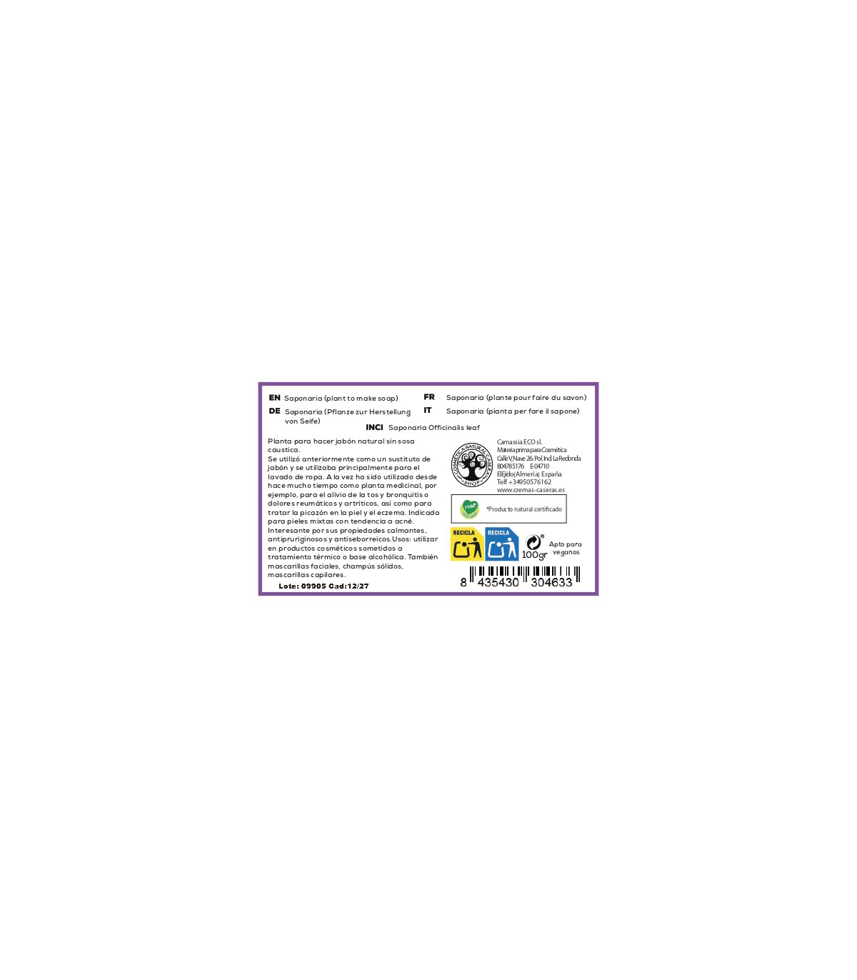 Microbiología: Aunque analizamos lotes en laboratorio, el mismo lote puede dar diferentes resultados de carga microbiológica, y a pesar de tratarse de plantas recolectadas del campo tal cual, son destinadas a diferentes usos como es la elaboración de cosméticos, por lo que se recomienda usar en productos sometidos a tratamiento térmico o análisis previo para demostrar su estabilidad.